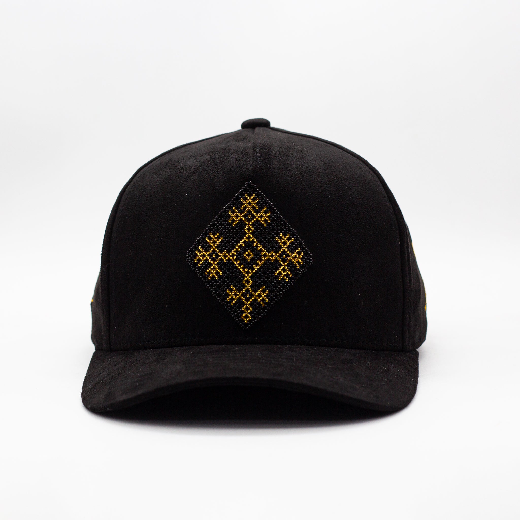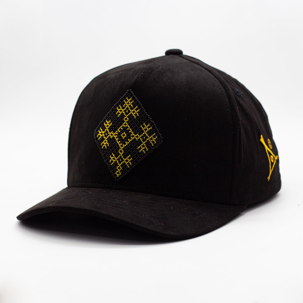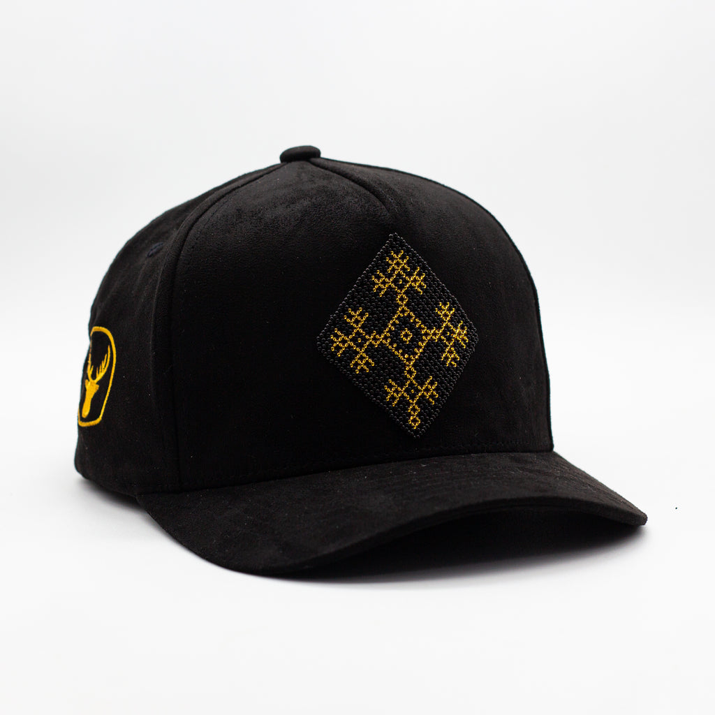 Elaborada en gamuza negra premium, esta gorra ofrece una textura profunda y elegante que sirve como el lienzo perfecto para el icónico Ojo de Dios —símbolo sagrado de cuidado, guía y claridad espiritual dentro de la cosmovisión wixárika.